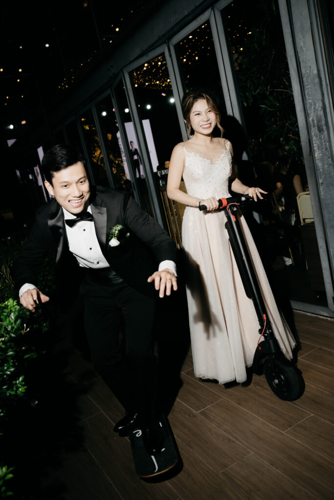 Cặp đôi của chúng ta còn một lần nữa mang đến sự bất ngờ đầy thú vị cho bữa tiệc với màn xuất hiện độc đáo cùng xe điện và ván trượt. Đồng thời mở đầu cho tiết mục quẫy hết mình cùng khách mời!